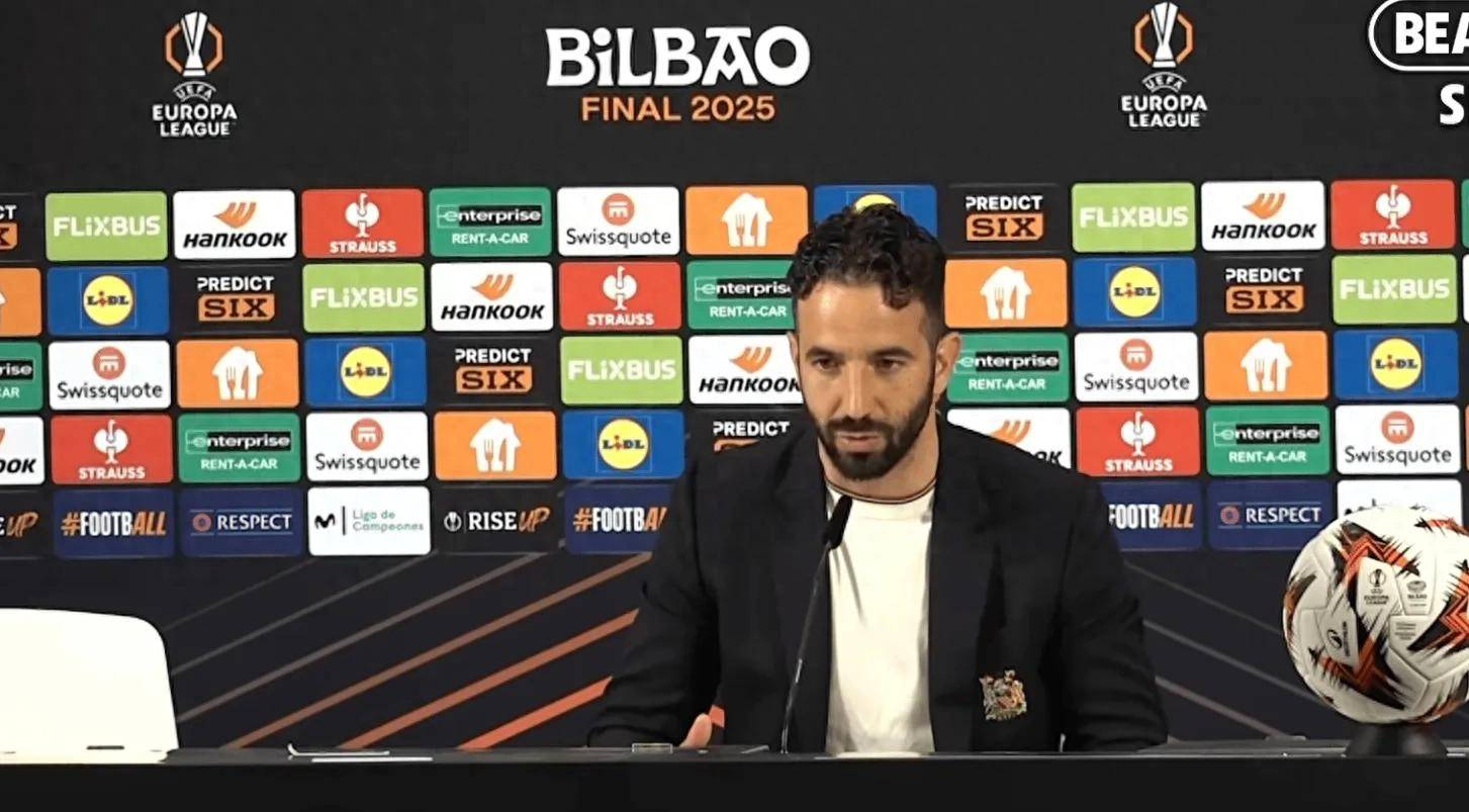 曼联主教练鲁本-阿莫林出席0-1输给热刺的欧联决赛赛后发布会。